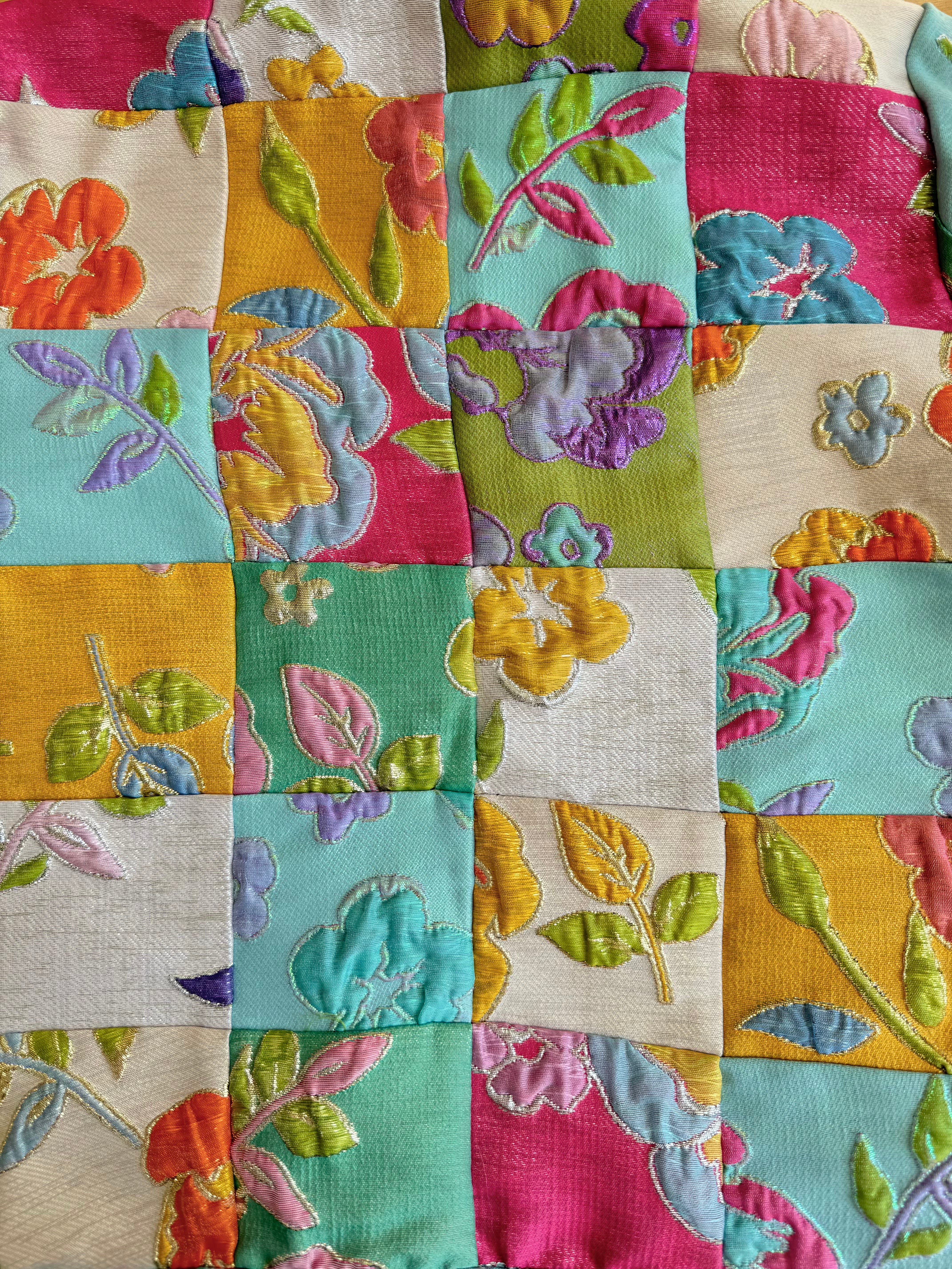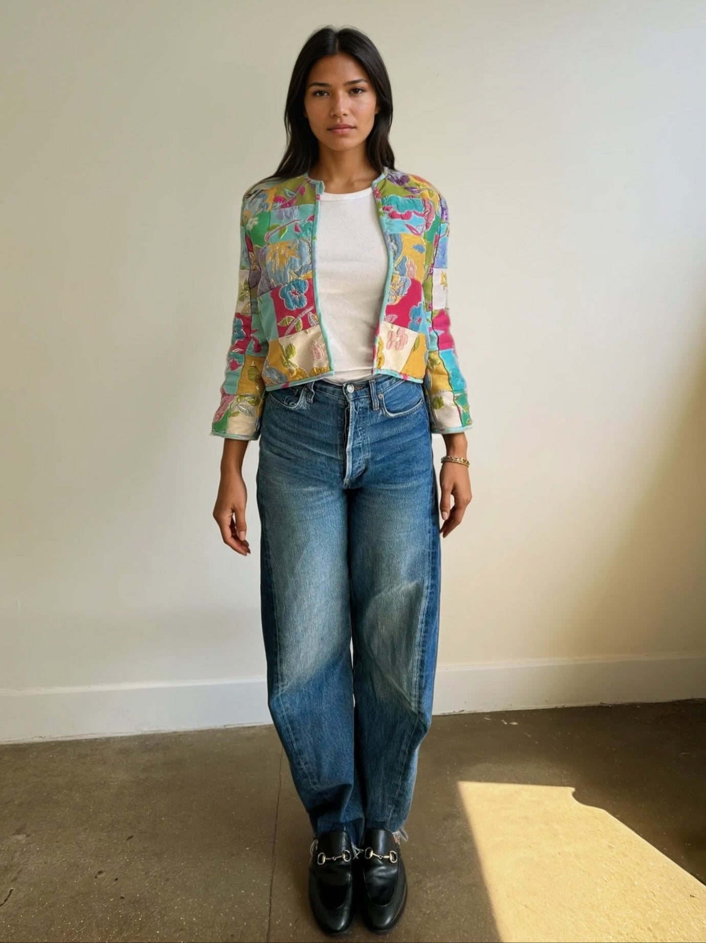 **PLEASE NOTE- EVERY SINGLE JACKET WILL SLIGHTLY VARY IN PATTERN AND BINDING COLOR.** Using scraps from our iconic Good Luck Dress, our team in NYC has patched together squares to make a cropped jacket/blazer. Three quarter inch sleeves and fully lined. Named after and inspired by the iconic Round Top Antique Show that happens in Texas